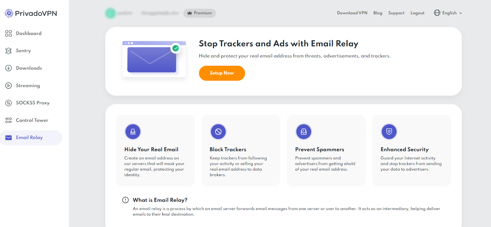 If you can’t find Email Relay on your PrivadoVPN dashboard, the most likely reason is that you have a Free account. Email Relay is a Premium feature and will only be available if you have a current, Premium subscription. If you need to upgrade, you can do so here and your account will be updated automatically.