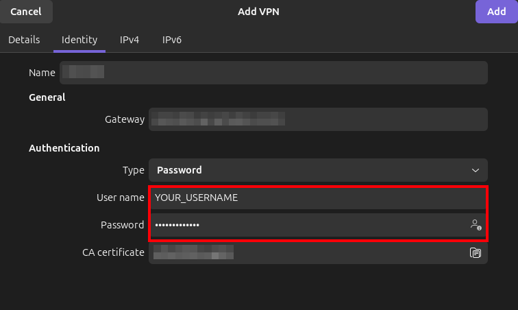 4. Go to Identity, enter your username and password and click "Add":